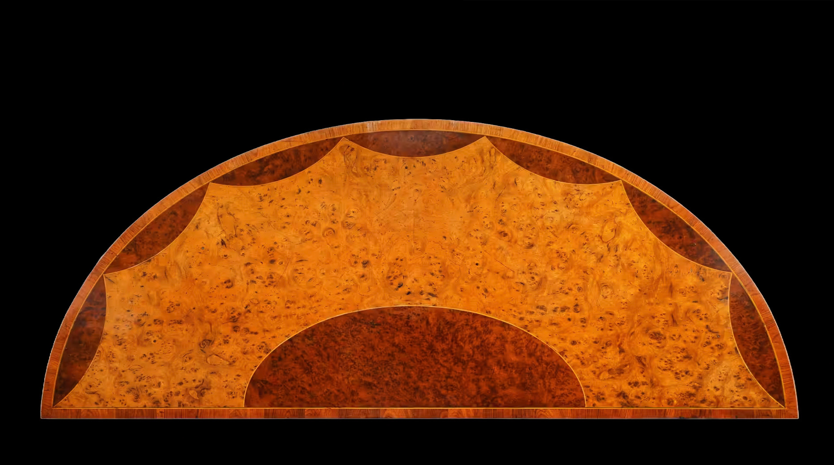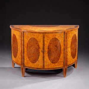 A Demi-Lune Commode Veneered in Tightly Figured Burr Elm and Inlaid with Fields of Burr Yew Wood.
